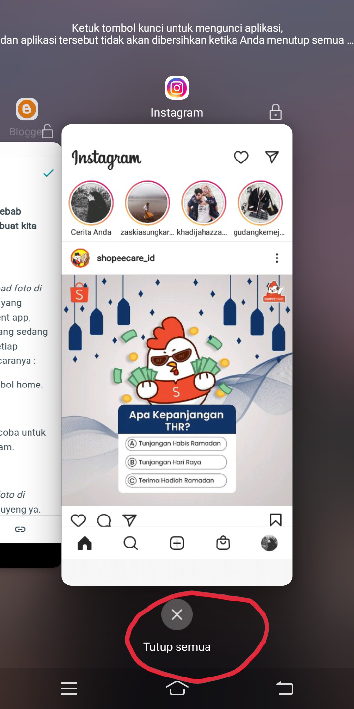Gagal atau tidak bisa mengupload foto di instagram ? Cara yang pertama yang paling mudah yaitu dengan recent app, atau menutup semua aplikasi yang sedang di jalankan. Untuk recent app setiap ponsel berbeda - beda. Berikut caranya :